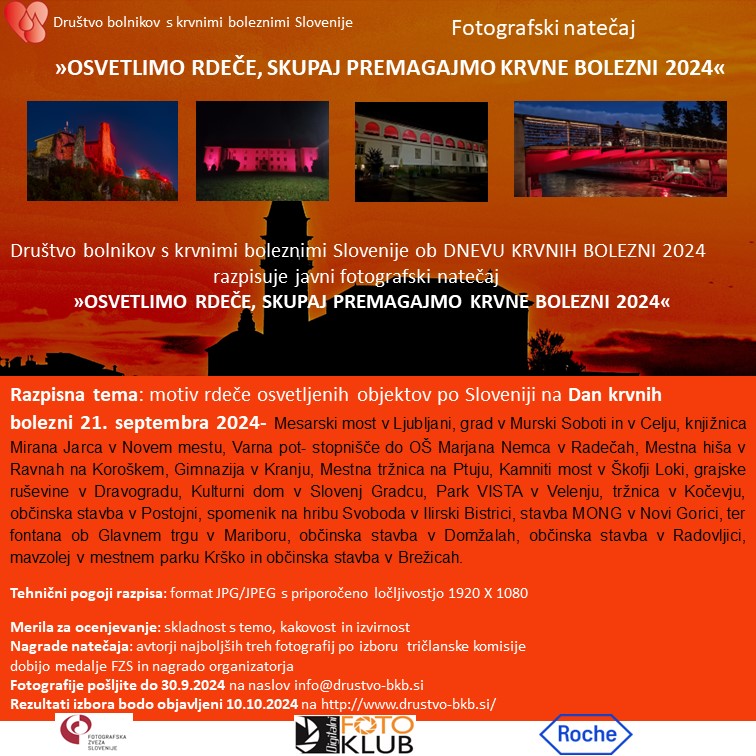 Društvo bolnikov s krvnimi boleznimi Slovenije in Digitalni foto kljub Celje pod pokroviteljstvom Fotografske Zveze Slovenije in podjetja Roche d.o.o. razpisuje javni fotografski natečaj »OSVETLIMO RDEČE, SKUPAJ PREMAGAJMO KRVNE BOLEZNI«. Razpisna tema so motivi rdeče osvetljenih objektov po Sloveniji. Najboljše tri fotografije bodo nagrajene z zlato, srebrno in bronasto medaljo FZS, ter z lepimi knjižnimi nagradami.