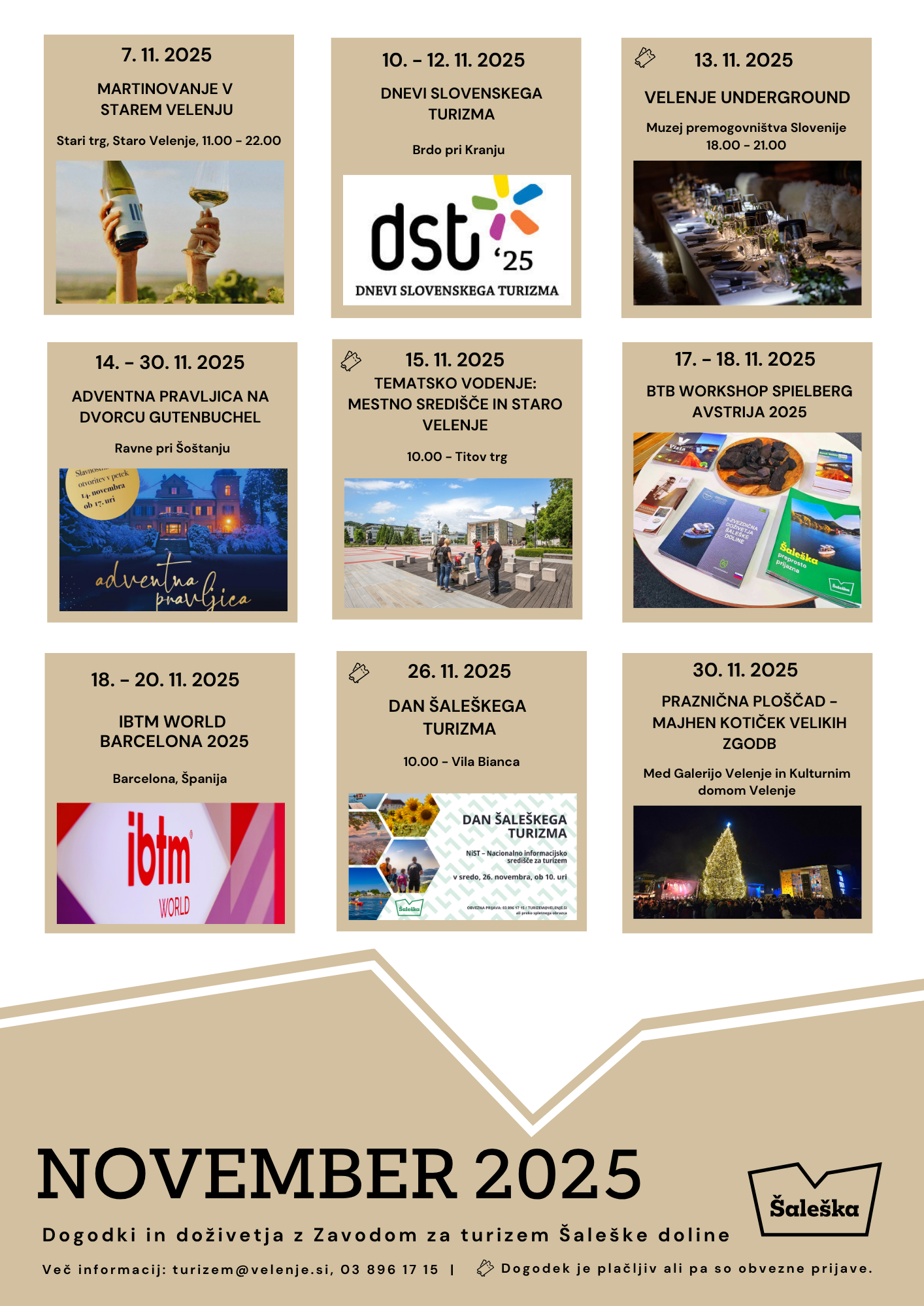 Martinovanje je vrhunec jesenskih družabnih dogodkov. Zato bomo tudi v Šaleški slavili novo vinsko letino na zdaj že tradicionalnem Martinovanju v Starem Velenju. Prevzeli nas bodo jesenski okusi in družabno vzdušje ob glasbenem in zabavnem programu. Sredi meseca pa s partnerji vabimo na prepoznavno petzvezdično doživetje Velenje Underground v Muzeju premogovništva Slovenije ter na tematsko vodenje o Mestnem središču in Starem Velenju. Novembra se odpravljamo tudi na osrednja slovenska in evropska strokovna srečanja – Dan slovenskega turizma na Brdu pri Kranju, vodilno strokovno srečanje avtobusnega in skupinskega turizma v Avstriji ter vodilni globalni dogodek za konferenčno in poslovno turistično industrijo v Španiji. V Vili Bianca pa bomo gostili osrednje lokalno strokovno srečanje – Dan šaleškega turizma, ki bo namenjen razvoju turizma v Šaleški in Sloveniji, vpogledu v trende ter predstavitvi NiST – Nacionalnega informacijskega središča za turizem. Tako doma kot v tujini jeseni združujemo raznolik program za obiskovalce in ambiciozen razvoj tržnih poti – z jasnim ciljem, da doživetja Šaleške povežemo z željami družin, skupin in poslovnih partnerjev. Vabljeni, da skupaj preživimo pisane jesenske tedne v Velenju in Šoštanju – z okusom tradicije, dotikom dediščine in svežino narave.