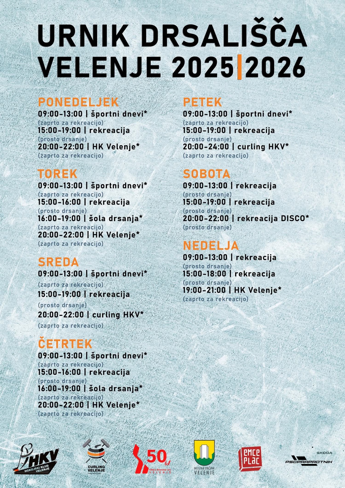 Drsališče bo ob ponedeljkih, sredah in petkih dopoldne namenjeno športnim dnevom, prosto drsanje bo mogoče od 15. do 19. ure, zvečer od 20. do 22. ure pa bo drsališče uporabljal Hokejski klub Velenje.