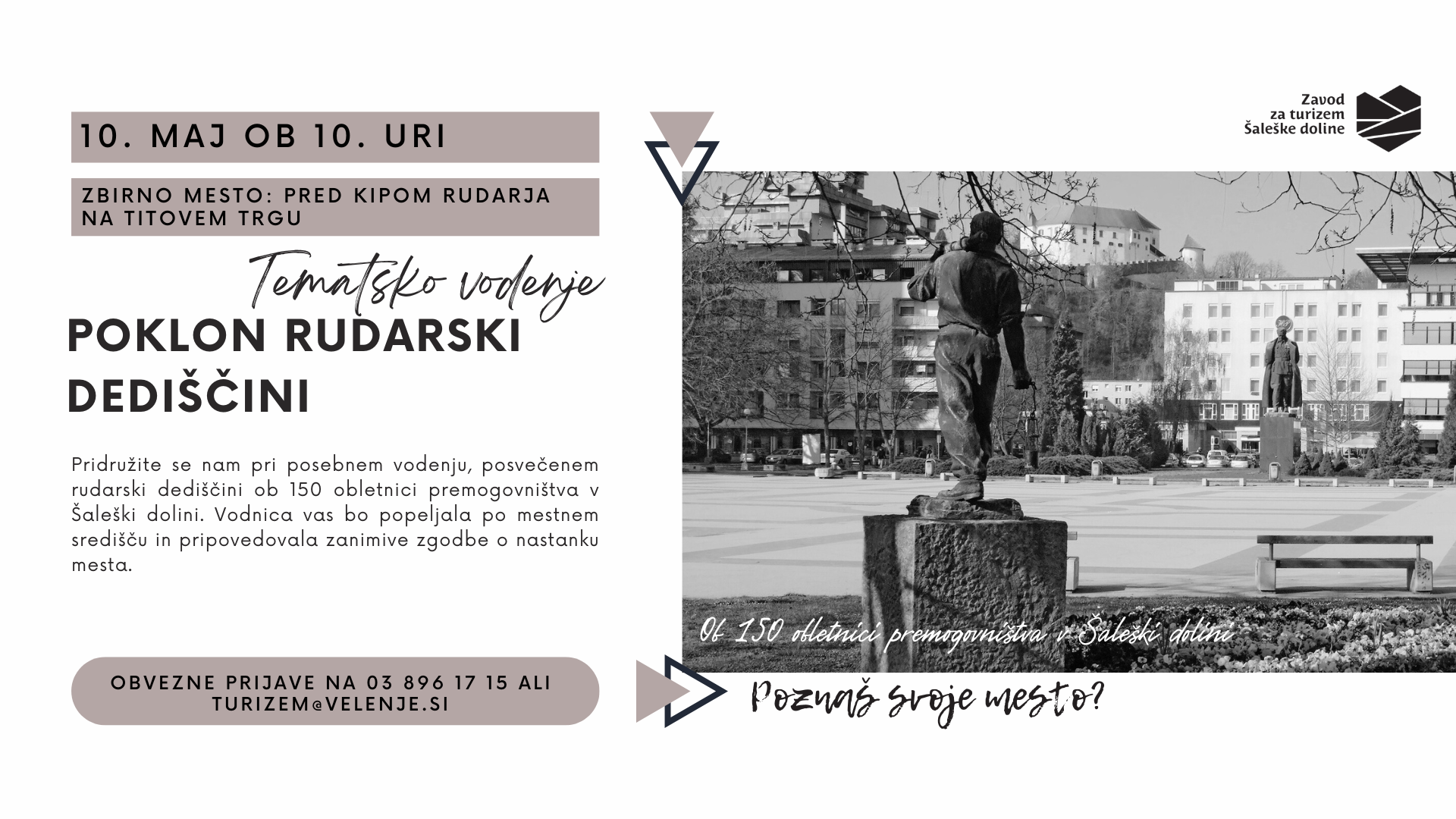 Brezplačno tematsko vodenje vam ponuja priložnost, da odkrijete zgodbo o nastanku mesta Velenje. Zgodbo vam bo predstavila lokalna turistična vodnica Adrijana Ježovnik. Zbor udeležencev bo ob kipu Rudarja na Titovem trgu, od koder se bomo sprehodili po ključnih točkah mestnega središča.
