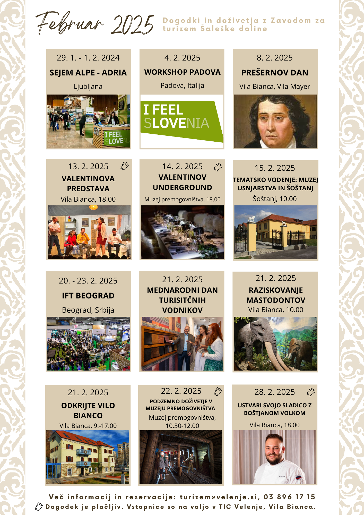Celoten februarski program predstavljamo v nadaljevanju sporočila za javnost. Hvaležni vam bomo, če boste na februarska druženja v Šaleški dolini povabili tudi druge. Spremljajte nas na spletni strani visitsaleska.si in na družbenih omrežjih @visitsaleska. Veselimo se vas! 29. januar–1. februar 2025 | Sejem Alpe-Adria 2025 Sejem Alpe-Adria poteka na Gospodarskem razstavišču v Ljubljani med 29. januarjem in 1. februarjem. Na sejmu v sodelovanju s Turistično zvezo Velenje predstavljamo ponudbo Šaleške doline. V okviru sejma se je podeljevale tudi mednarodna nagrada Jakob, ki predstavlja priznanje za inovativnost, kakovost in odličnost v turizmu. Tema letošnjega izbora je bila inovativna uporaba digitalizacije pri predstavljanju naravne in kulturne dediščine v turizmu s poudarkom na snovni in nesnovni dediščini. Med finalisti je tudi naše 5* doživetje Skrivnosti potopljenih vasi, ki je osvojilo 3. mesto. Za omenjeno doživetje je možen nakup darilnih bonov. Več informacij in rezervacije: turizem@velenje.si, 03 896 17 15 8. februar 2025 | Prešernov dan, slovenski kulturni praznik Slovenski kulturni praznik je priložnost, da se poklonimo bogati dediščini kulturno-umetniške ustvarjalnosti. Ob tem dnevu bodo nekateri muzeji in galerije v Šaleški dolini odprli svoja vrata z brezplačnimi ogledi in posebnimi programi. Dan odprtih vrat bo potekal tudi v Vili Bianca in Vili Mayer. Ob 10. in 15. uri bo v Vili Mayer potekalo javno vodstvo po vili in zbirkah. Praznični dan bo priložnost za raziskovanje kulturnih zakladov in doživljanje dediščine Šaleške doline. Več informacij: turizem@velenje.si, 03 896 17 15 4. februar 2025 ꟾ Workshop Padova V Padovi predstavništvo STO v Italiji organizira workshop slovenskega turističnega gospodarstva. Skupaj s predstavniki Term Topolšica se bomo udeležili dogodka ter predstavili naše novosti in ponudbo Šaleške doline. 13. februar 2025 ꟾ 18.00 ꟾ Vila Bianca Valentinova predstava: Poročil se bom s svojo ženo V četrtek, 13. februarja, vas ob 18. uri vabimo v Vilo Bianca na komično Valentinovo predstavo z naslovom Poročil se bom s svojo ženo, ki jo uprizarja Kulturno prosvetno društvo Šentilj. Predstava je polna presenečenj in toplih trenutkov, ki pokažejo, da ljubezen vedno najde pot, četudi na najbolj nenavadne načine. Po predstavi bomo proslavili praznik zaljubljencev s kozarcem penine ali brezalkoholne pijače. Cena vstopnice: 13 EUR. Vstopnice so na voljo v Vili Bianca vsak dan med 9. in 17. uro. Število mest je omejeno. Več informacij: turizem@velenje.si, 03 896 17 15 14. februar 2025 | 18.00 | Muzej premogovništva Slovenije Valentinovo, praznik zaljubljencev, ste zagotovo doživeli že na mnoge različne načine. Si predstavljate, da ga tokrat v družbi vam drage osebe preživite kar 160 metrov pod zemljo? Presenetite ljubljeno osebo z vabilom na 5* doživetje Velenje Underground. Vabimo vas na pobeg v podzemno kraljestvo, kjer boste del neponovljive romantične zgodbe. Prepustite se kulinariki, ki združuje inovacije s tradicijo v ambientu zgodovinskih rudarskih rovov. Ta dogodek ni zgolj obrok, temveč potovanje, ki vam bo zagotovo pustilo lepe spomine. Število mest je omejeno. Cena: 185 EUR / osebo Več informacij in rezervacije: turizem@velenje.si, 03 896 17 |