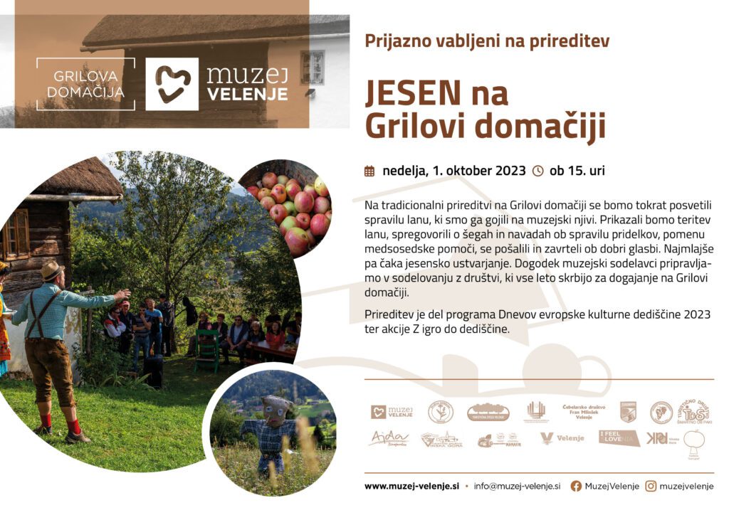 V nedeljo, 1. oktobra, ob 15. uri bo potekala tradicionalna prireditev Jesen na Grilovi domačiji. Na tokratnem dogodku se bomo posvetili spravilu lanu, ki smo ga gojili na muzejski njivi. Prikazali bomo teritev lanu, spregovorili o šegah in navadah ob spravilu pridelkov nekoč, pomenu medsosedske pomoči, se pošalili in zavrteli ob dobri glasbi. Najmlajše obiskovalce čaka jesensko ustvarjanje. Dogodek pripravljamo v sodelovanju z društvi, ki vse leto skrbijo za dogajanje na Grilovi domačiji. Na dogodku bo potekal tudi vpis med Mlade muzealce. Dogodek je del programa Tedna kulturne dediščine in Dnevov evropske kulturne dediščine ter akcije Z igro do dediščine.