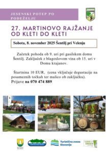 - 8. 11. 2025, ob 9.00: 27. Martinovo rajžanje od kleti do kleti v Šentilju pri Velenju. Zbirno mesto: gasilski dom Šentilj, Startnina 10 EUR: vključuje degustacije na posameznih točkah ter malico ob zaključku.