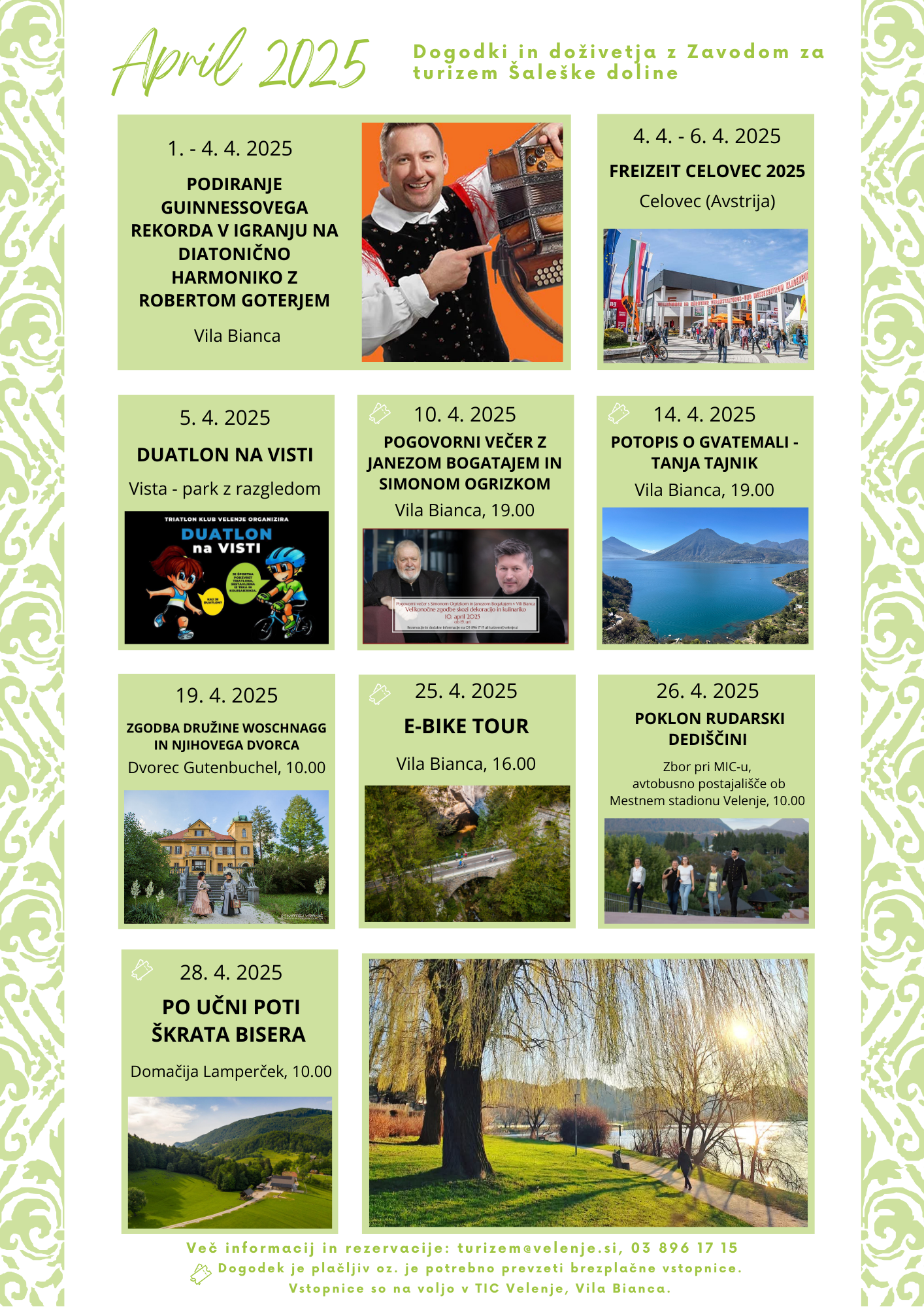 V Vili Bianca bo med 1. in 4. aprilom potekalo podiranje Guinnessovega rekorda v igranju na diatonično harmoniko z Robertom Goterjem. Kulturni utrip destinacije bomo obogatili tudi s pogovornim večerom o velikonočnih običajih, potopisnim predavanjem o Gvatemali in brezplačnimi tematskimi vodenji po dvorcu Gutenbüchel, rudarski dediščini in učni poti Škrata Bisera.