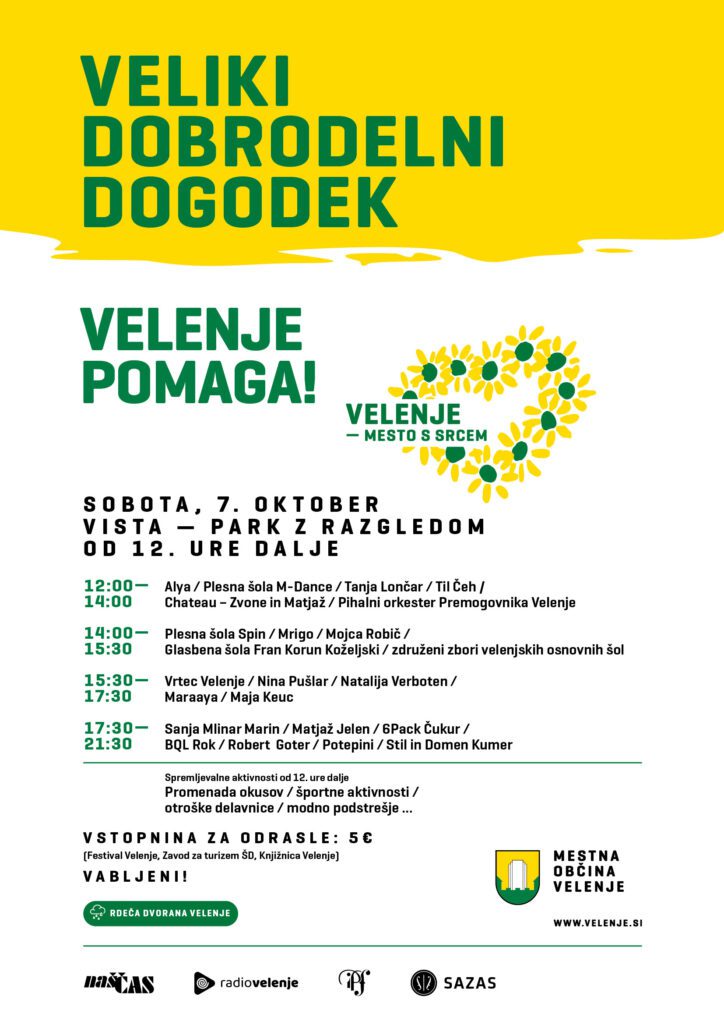 26. 09. 2023 Program dobrodelnega dogodka – Velenje pomaga! VELIKI DOBRODELNI DOGODEK – VELENJE POMAGA Sobota, 7. oktober Vista – park z razgledom od 12. ure dalje Nastopili bodo: 𝟭𝟮:𝟬𝟬—𝟭𝟰:𝟬𝟬 – AlyaMusic ⁄ M-Dance ⁄ Citrarka Tanja Lončar ⁄ Til Čeh / Chateau – Zvone in Matjaž ⁄ Pihalni orkester Premogovnika Velenje 𝟭𝟰:𝟬𝟬—𝟭𝟱:𝟯𝟬 – SPIN – love to dance ⁄ Mrigo ⁄ Mojca Robič ⁄ Glasbena šola Fran Korun Koželjski Velenje in Umetniška gimnazija Velenje ⁄ združeni zbori velenjskih osnovnih šol 𝟭𝟱:𝟯𝟬—𝟭𝟳:𝟯𝟬 – Vrtec Velenje ⁄ Nina Pušlar ⁄ Natalija Verboten ⁄ Maraaya ⁄ Amaya 𝟭𝟳:𝟯𝟬—𝟮𝟭:𝟯𝟬 – Sanja Mlinar Marin ⁄ Jelen Matjaž 6pack Čukur ⁄ BQL ⁄ Robert Goter Poln P ⁄ Ansambel Potepini ⁄ Ansambel Stil in Domen Kumer Dogodek bodo povezovali: Peter Poles, Andreja Petrovic, Maja Oderlap, Marko Govek, Maja Gorjup Zdovc, Diana Sobočan. Spremljevalne aktivnosti od 12. ure dalje: Promenada okusov / športne aktivnosti / otroške delavnice / modno podstrešje … Nakup vstopnic – 5 EUR: Festival Velenje (Dom kulture Velenje), Knjižnica Velenje in ZTŠD (Vila Bianca). Do takrat lahko pomagaš tako, da pošlješ SMS 𝗩𝗘𝗟𝗘𝗡𝗝𝗘𝗣𝗢𝗠𝗔𝗚𝗔𝟱 na 𝟭𝟵𝟭𝟵