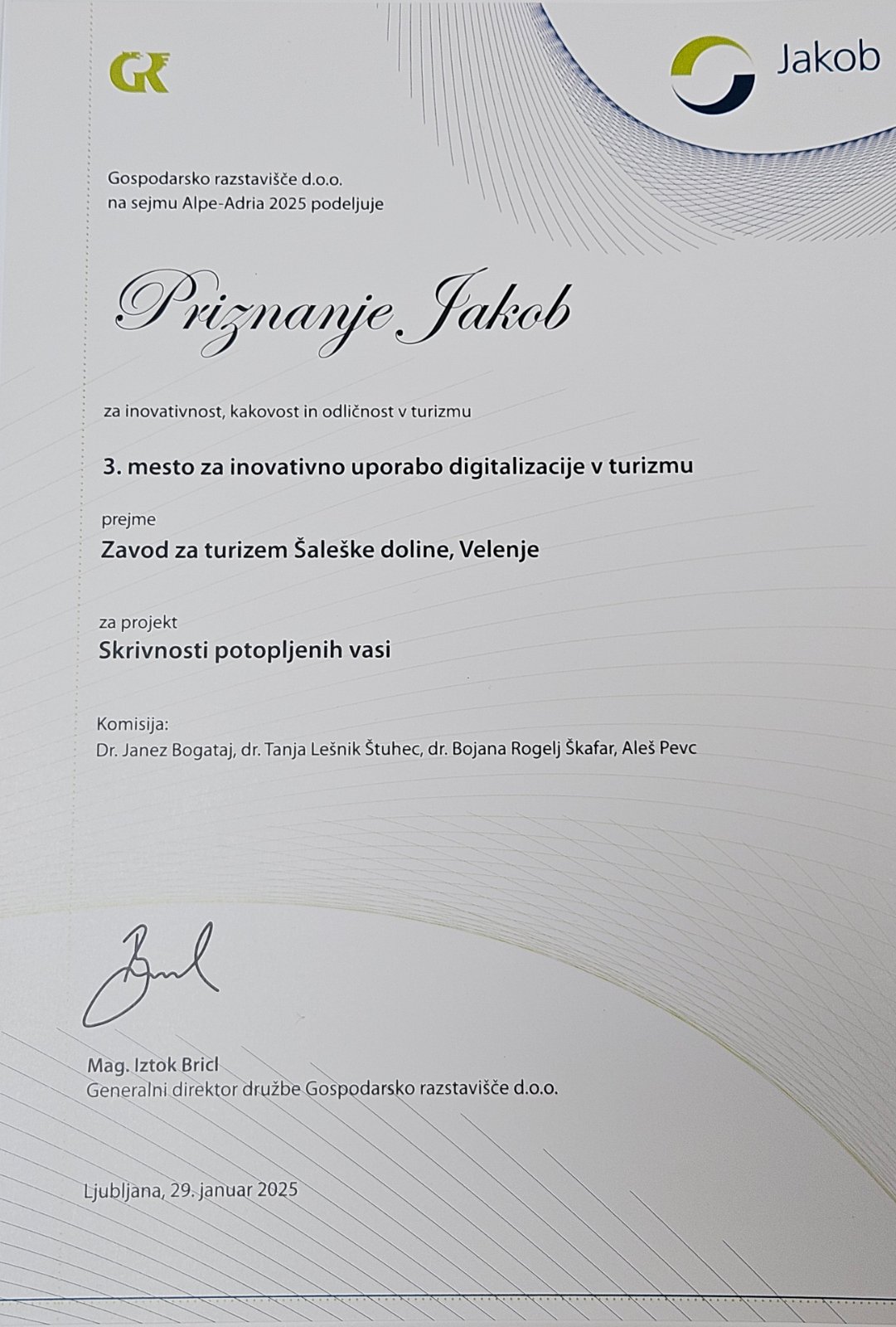 Ponosno sporočamo, da je Zavod za turizem Šaleške doline s produktom “Skrivnosti potopljenih vasi” danes, 29. januarja 2025, osvojil 3. mesto na prestižnem tekmovanju za nagrado JAKOB. Letošnje tekmovanje se je osredotočalo na inovativno uporabo digitalizacije pri ohranjanju naravne in kulturne dediščine.