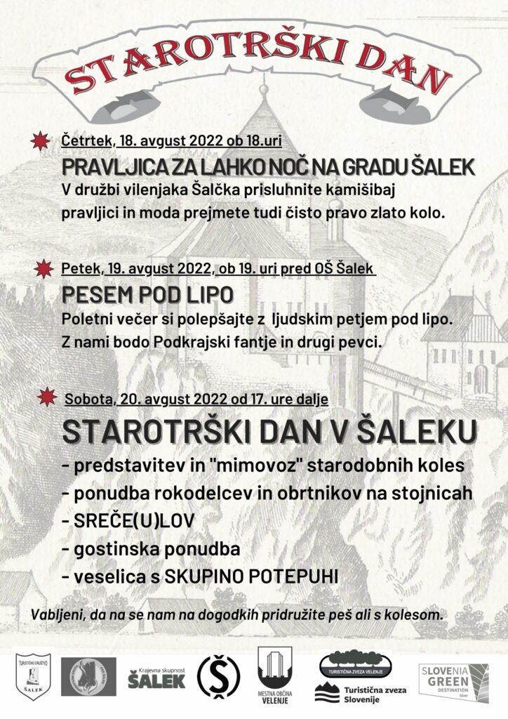 Sobota 20. avgusta 2022 je rezervirana za tradicionalni Starotrški dan, s pričetkom ob 17.00 uri. Letošnja osrednja tema so kolesa in njihova uporaba v času od konca 19. stoletja pa vse do konca II. svetovne vojne. Ogledati si bo mogoče “obrtna” kolesa iz muzejske zbirke Blažiš, ki jo ima gospod Peter Habe. Prav tako bodo na ogled kolesa lokalnega zbiratelja Darka Odra.