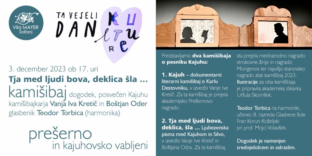 v nedeljo, 3. 12. 2023 ob 17. uri bomo predstavili dva nagrajena kamišibaja o Kajuhu, v izvedbi Vanje Ive Kretič in Boštjana Odra, ki ju bo glasbeno pospremil Teodor Torbica na harmoniki.