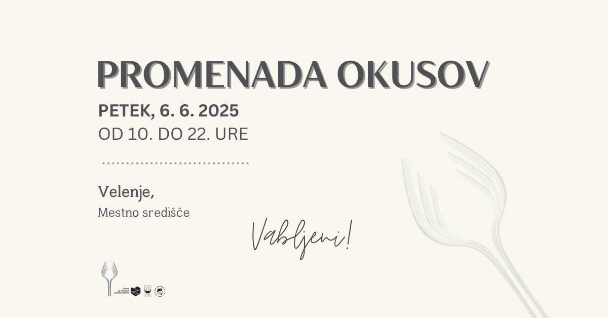 Vabimo vas k sodelovanju na kulinarični prireditvi Promenada okusov, ki bo tudi letos razvajala brbončice obiskovalcev v središču Velenja – v dveh terminih, in sicer v petek, 6. junija, in v petek, 5. septembra 2025, med 10. in 22. uro.